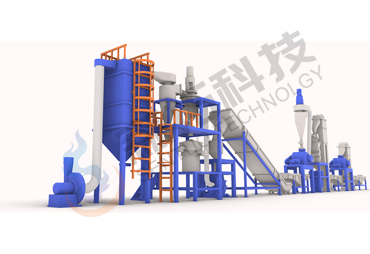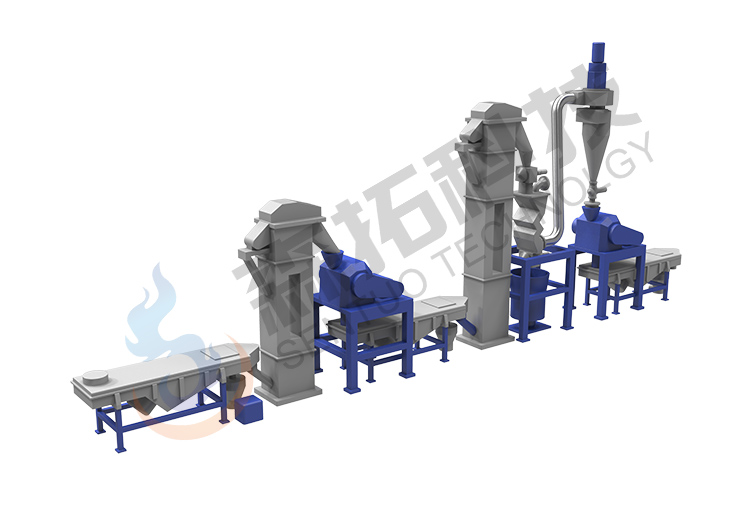 經(jīng)熱解爐處理后的物料通過(guò)破碎機(jī)破碎,破碎后的物料經(jīng)過(guò)篩分機(jī)將黑粉和銅鋁極片、外殼分離,并通過(guò)管道輸送至黑粉料倉(cāng)。剩余銅鋁、外殼進(jìn)入多組分選篩分出外殼,外殼直接打包入庫(kù);鋁箔和銅箔進(jìn)入銅鋁分選機(jī)篩分銅鋁,分出的銅、鋁直接噸包收集。
