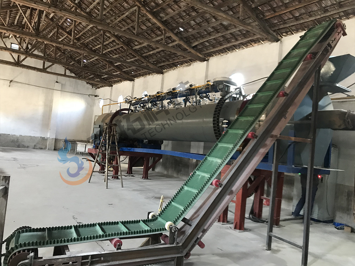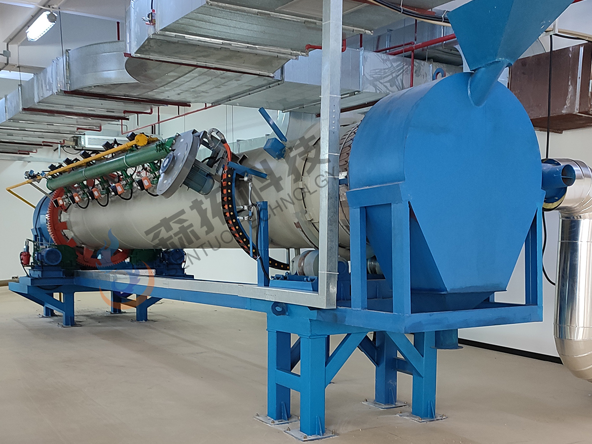 該窯爐的整體呈傾斜筒狀設(shè)置,在驅(qū)動機構(gòu)帶動下左右旋轉(zhuǎn)搖擺,物料從較高的進(jìn)料端進(jìn)入,既沿圓周方向翻滾又沿軸向向較低的出料端移動.燃燒器可以沿徑向排列在窯爐中部,于此處對物料進(jìn)行煅燒加熱,產(chǎn)生的熱量會從窯中部傳送到窯頭,使受熱更均勻。由于筒體內(nèi)熱量會被抽取出來,本實用新型采用耐火磚設(shè)計,使筒體能有效保溫,達(dá)到節(jié)能效果。